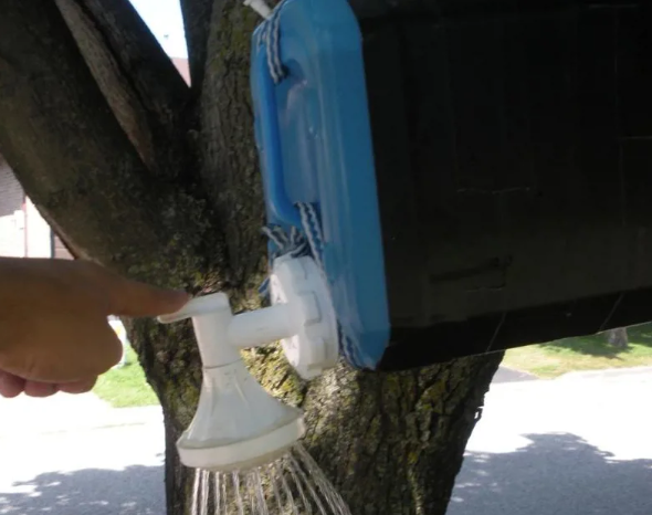 Grab a large bottle that can hold enough water to take a shower. Attach a watering head to your bottle’s opening. If it has a tap, you can easily turn it on or off. Fill up your “shower”, whenever you need to wash, and hang it from a branch when you are done.