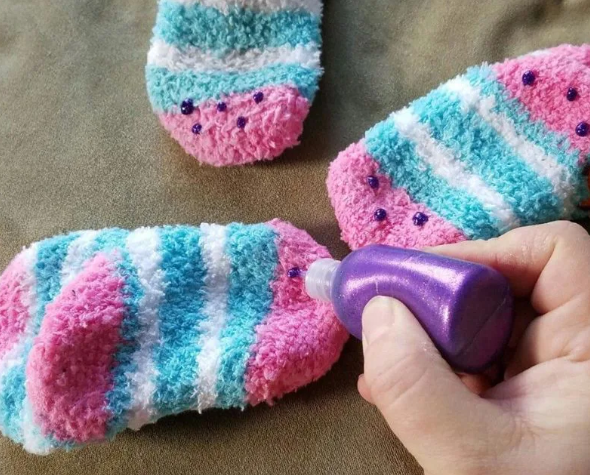 Start with some puffy paint. Add all sorts of designs, including their name, favorite characters or colorful patterns, to the socks’ underside. After the paint dries, it will act as non-slip pad on their socks. They can now run without fear of their socks injuring them.