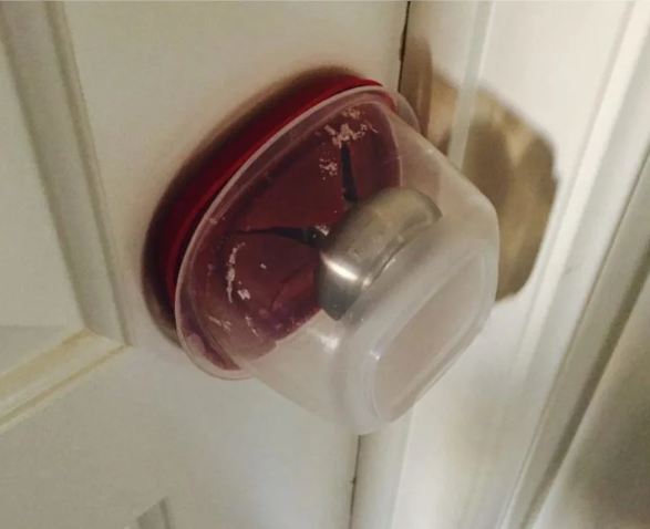 Take any Tupperware with a lid. Make a hole in the lid large enough for the handle to fit over it, but not so big that it is difficult to remove. Add the box to the doorknob, so that they cannot lock the door but can still use it from the other side.