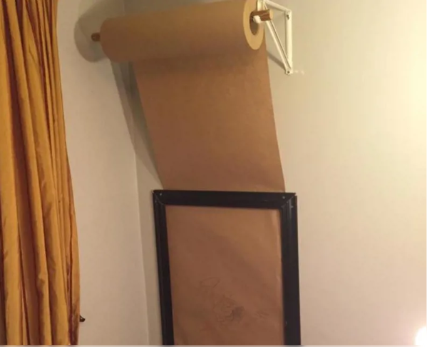 Attach the frame to the walls, leaving gaps at the top and the bottom. Hang the roll a few feet over the frame, and then attach the roll of paper. Then, the kids can use the paper to create their endless whiteboard by pulling it through the frame.