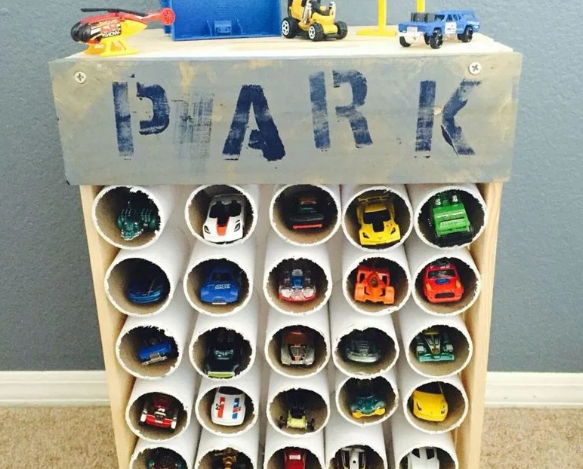 You will need an old wooden box and cardboard tubes. Simply stand the box at one end, and place your cardboard tubes throughout. You can finish the project with a label that says “Parking Garage” and toy cars will no longer be a problem.