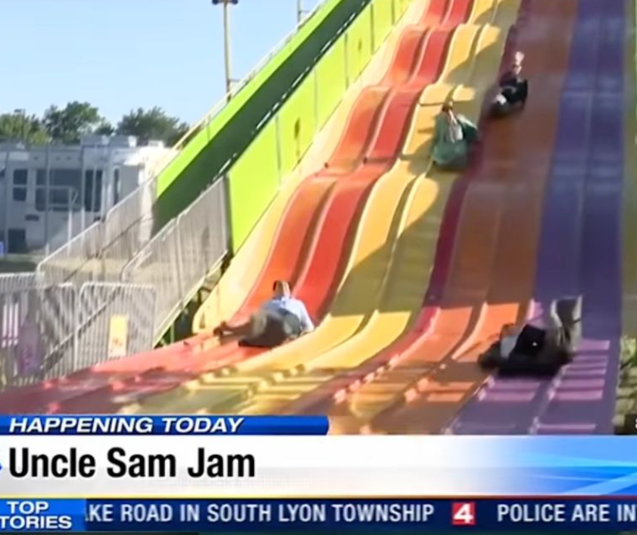 A reporter for Local 4 and some others went down a slide on live television. He tried to pretend that it didn’t happen, but we know he was in pain the next day.