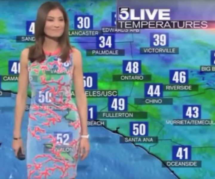 During a 2016 live broadcast, the dress of KTLA 5 Meteorologist Liberte Cha was responsible for an unexpected wardrobe malfunction. Chan’s dress color matched the green screen a bit too well. Chan’s colleague, anchor Chris Burrous came to Chan’s rescue, handing over his suit jacket live on air.